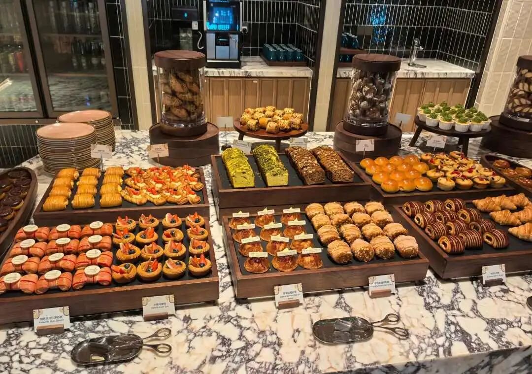 位于酒店一层的「STREAT 路间」是全日制餐厅,也是最先被旅客接触到的公共空间之一。餐厅名称源于 Street(街道)与 Eat(就餐)的组合,定位强调“精致但有烟火气”的都市混搭风格。内部布局采用下沉式中央区域配合围绕式卡座,绿植与装饰风扇点缀其中,形成一个充满生机的微型街区感。早餐为半自助形式,辅以扫码点餐机制,菜单融合中西风味,尤其强调本地食材——例如焖面、椰香可丽饼、现煮海南粥粉,都是日常客评中的高频亮点。
