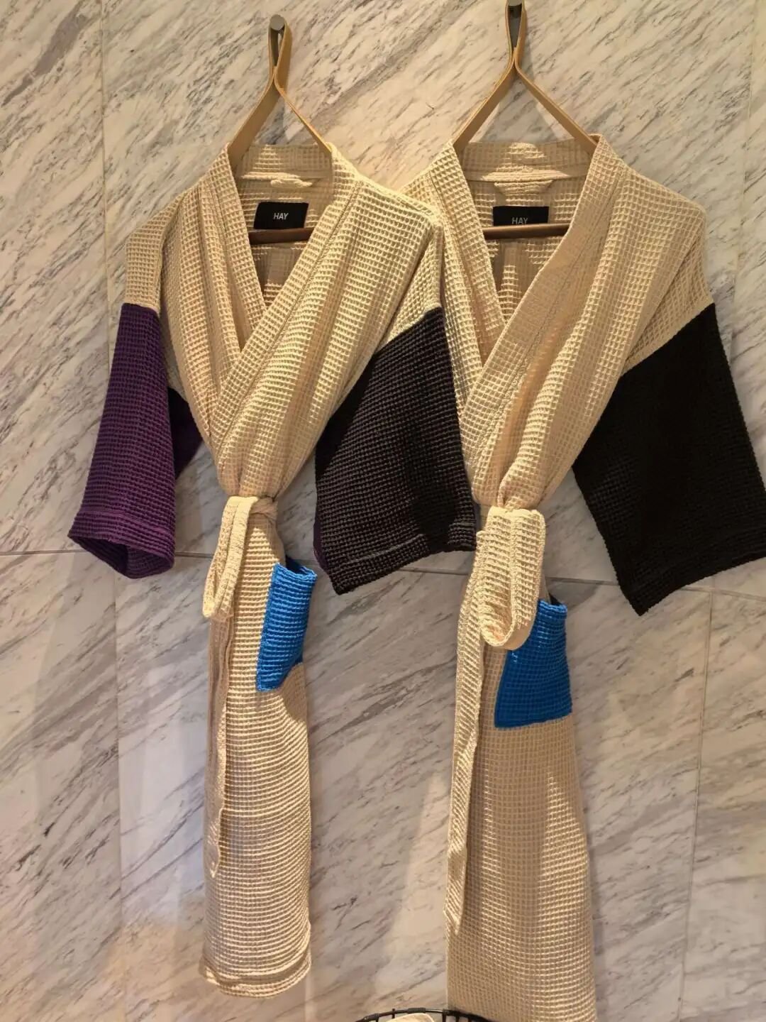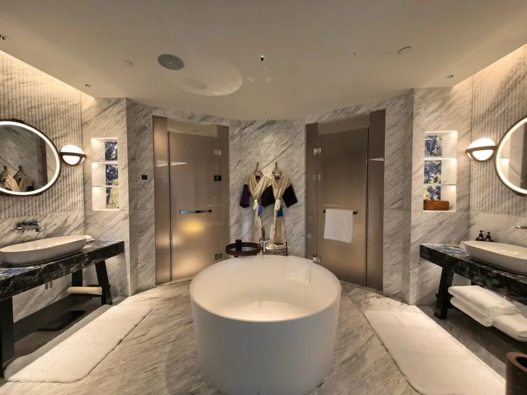 客房内部标配以实用与质感兼具为导向。浴室区域多采用整块天然大理石台面、圆形独立浴缸,并统一配备来自丹麦的HAY品牌浴袍及法国香氛品牌 MAISON 21G 的定制备品。香型以“海洋香草根”为灵感,契合海滨气候的清新与层次。